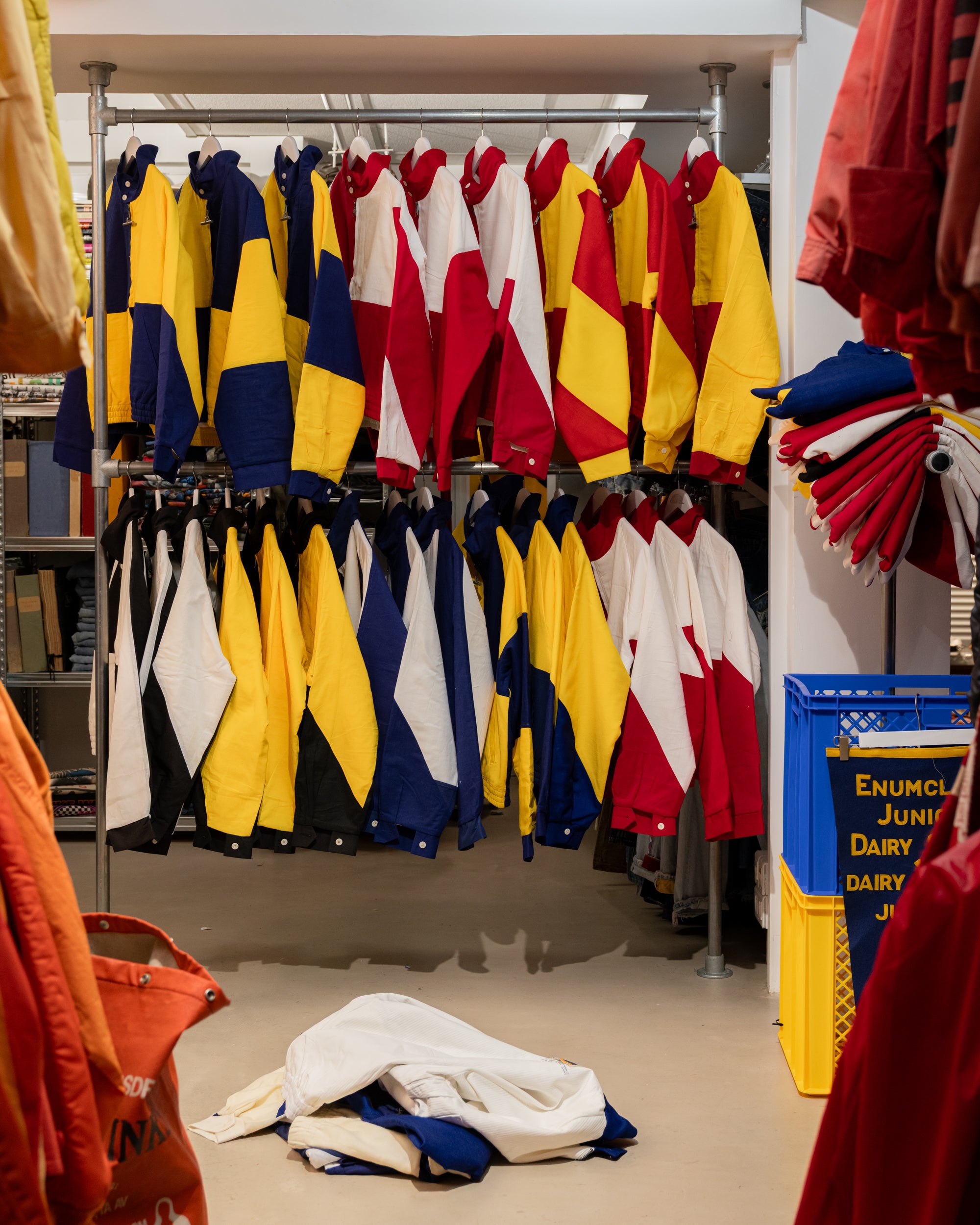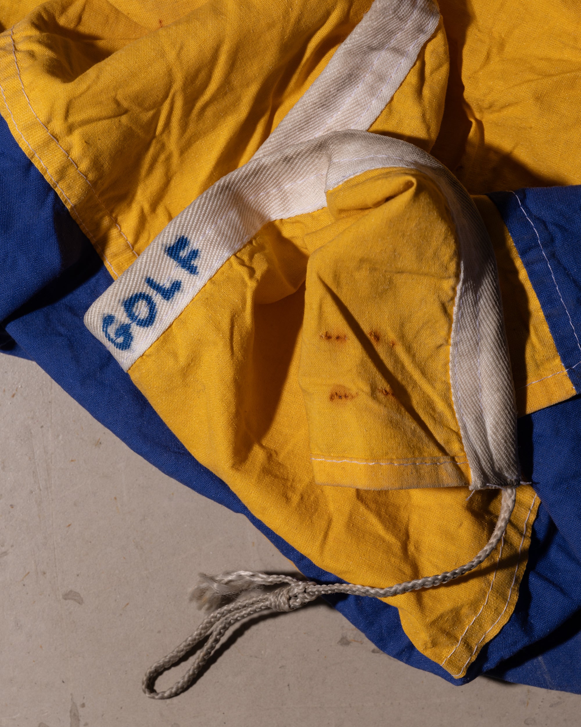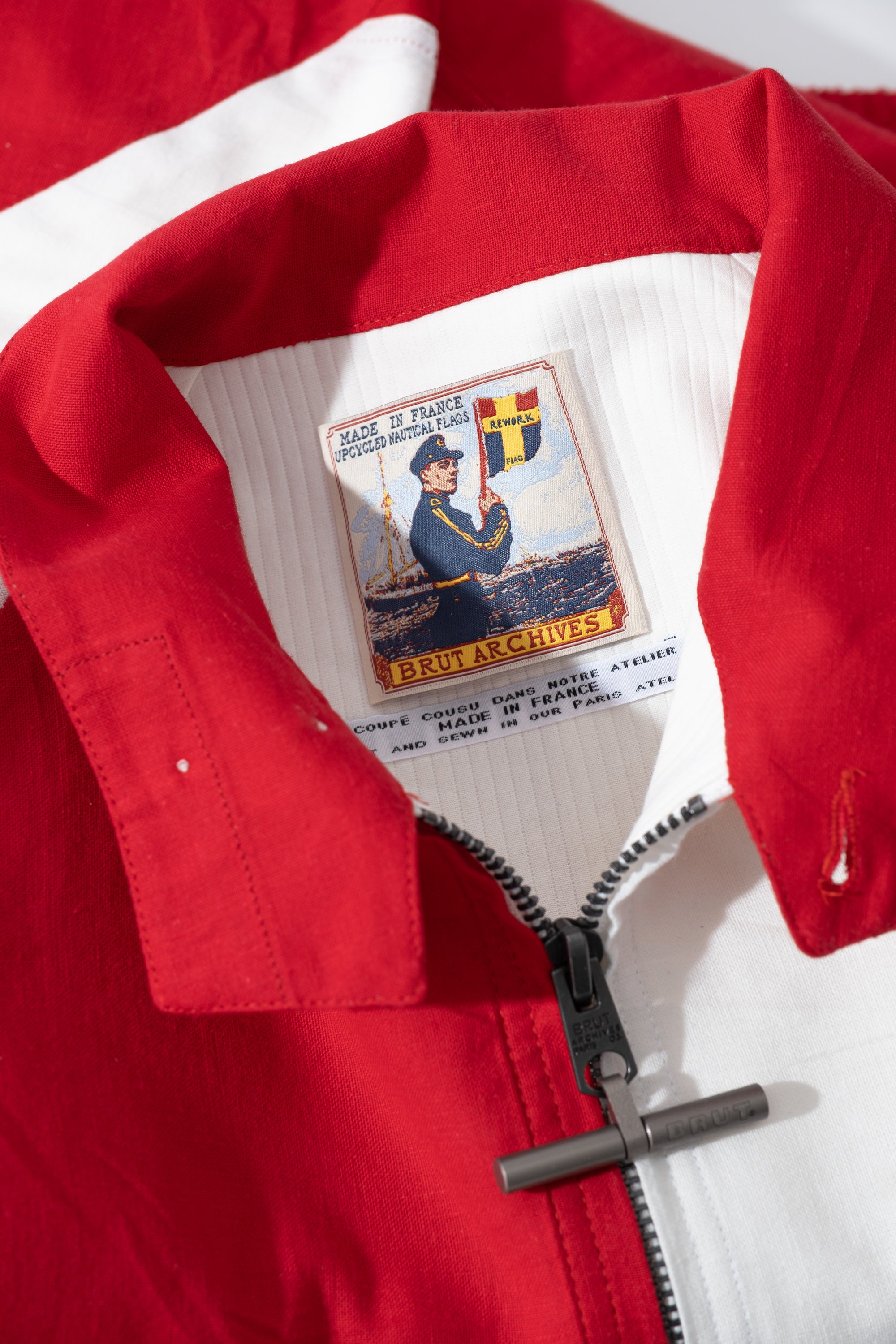 The Rework Flag Jacket is crafted in our Parisian atelier from authentic vintage nautical flags. The process begins with recovered textiles, cut and balanced by hand, turning fabric once exposed to salt and wind into a structured silhouette.