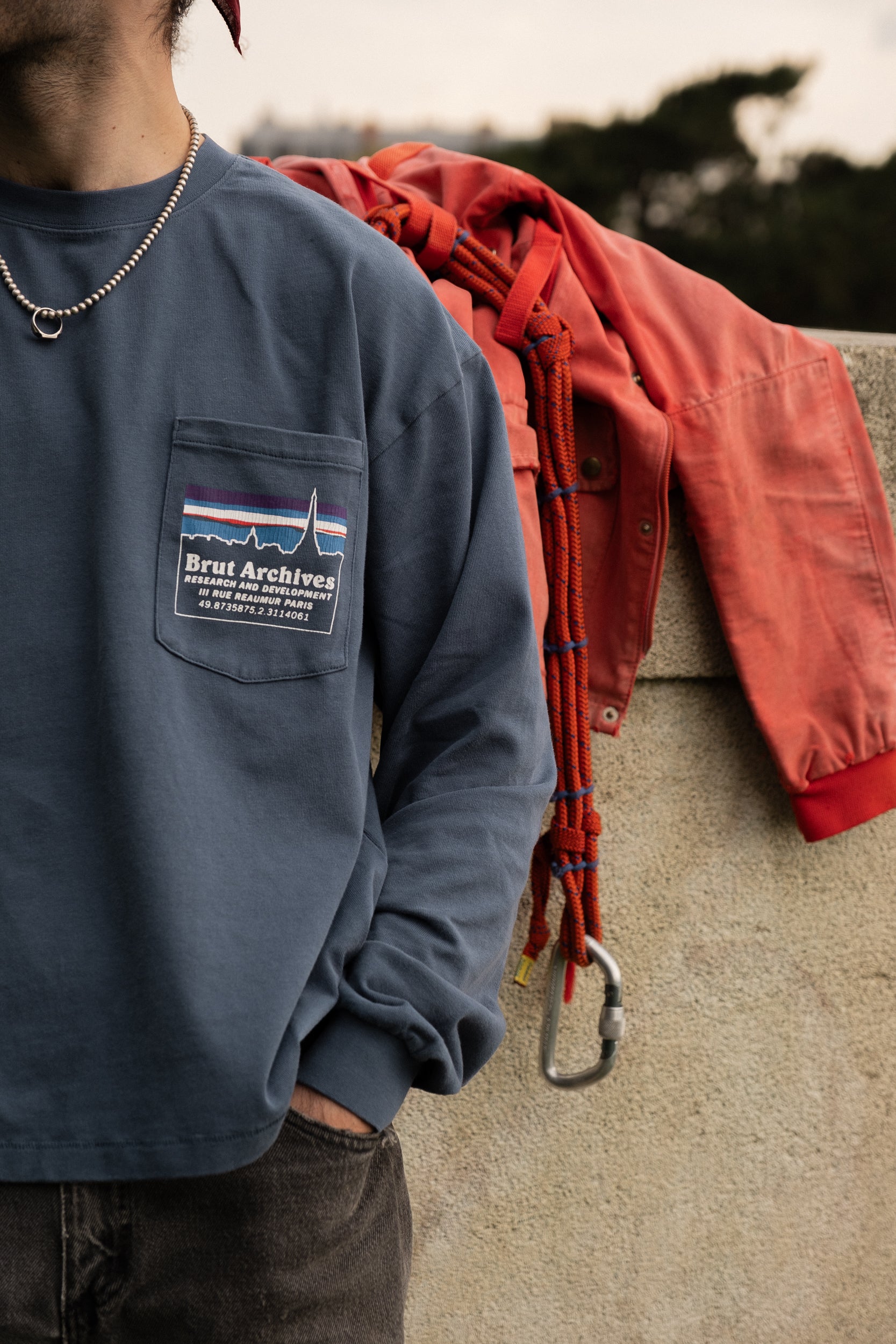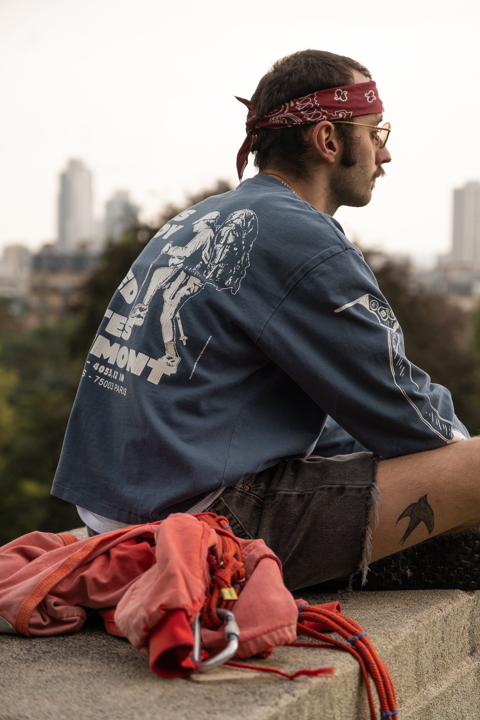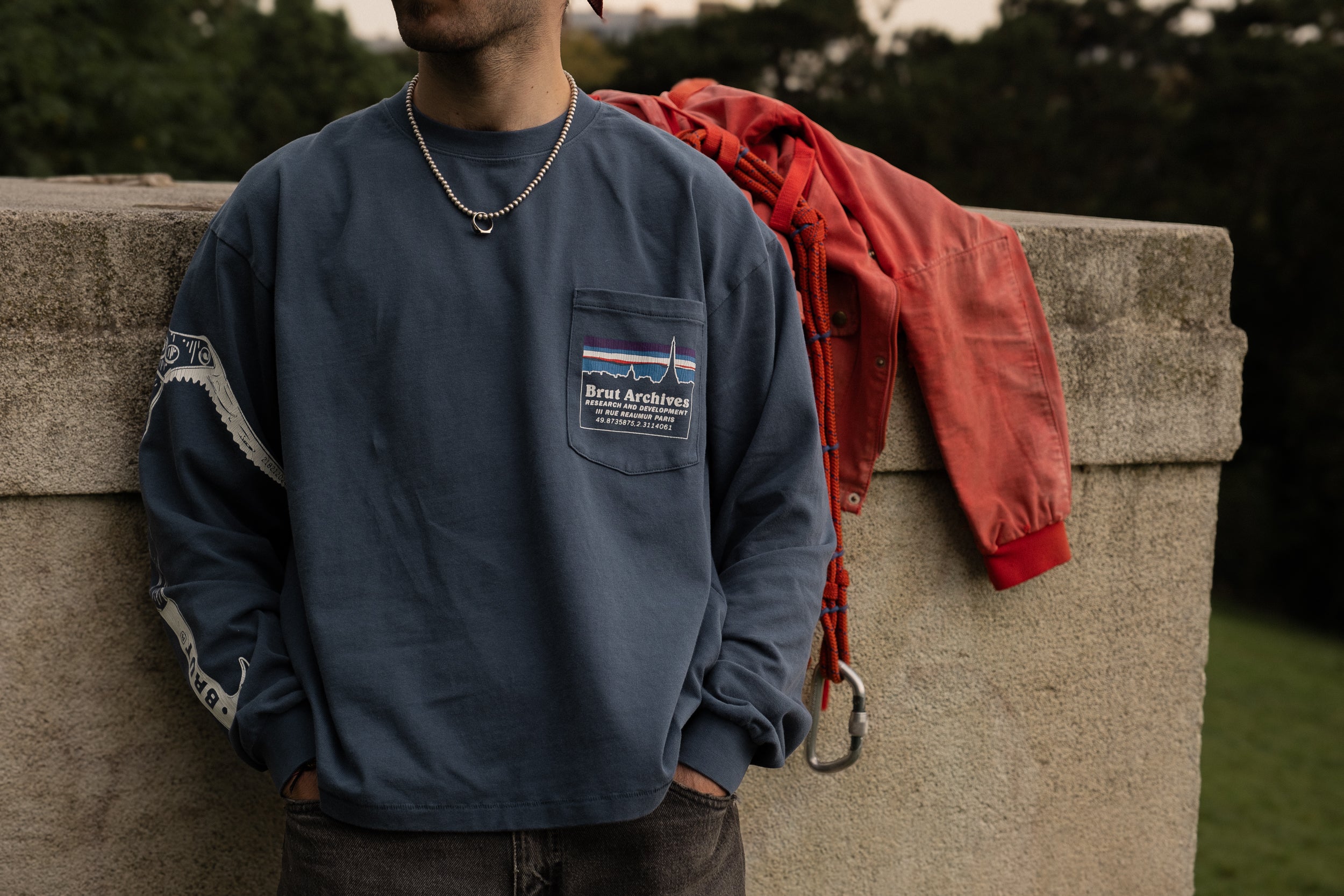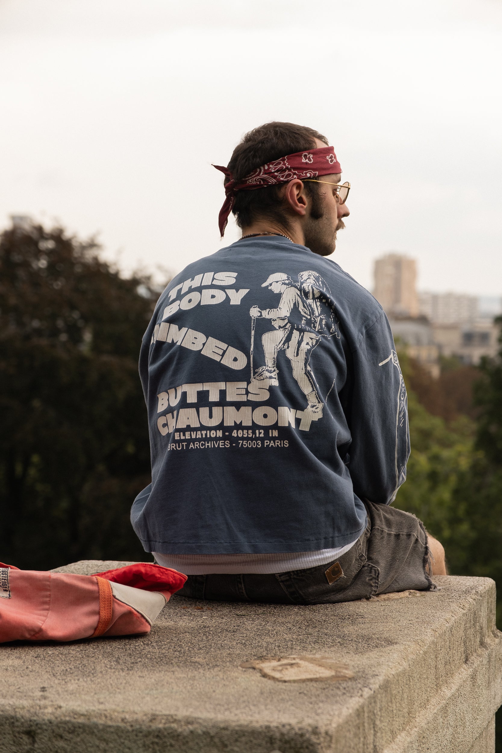 This navy long-sleeve tee features a vintage print, drawing inspiration from outdoor sports gear, especially "trophy" shirts from climbing, trail running, and hiking. All of it comes with a touch of irony and humor. Made from soft yet durable cotton, it offers both comfort and longevity, perfect for a casual yet stylish look.