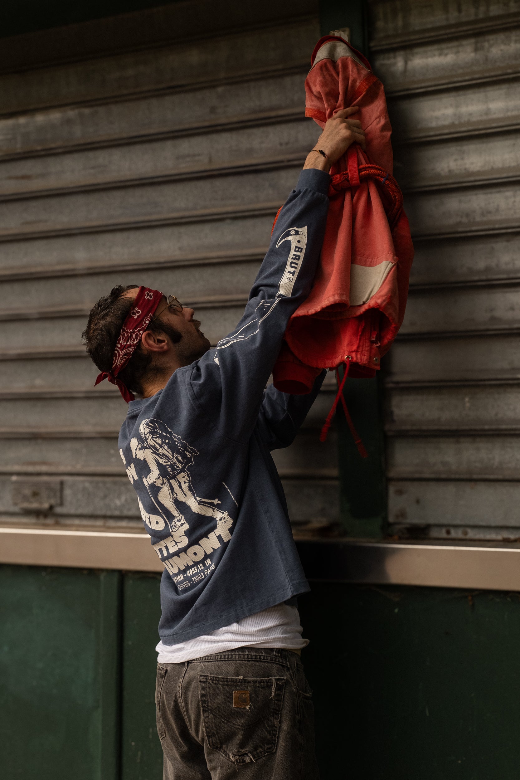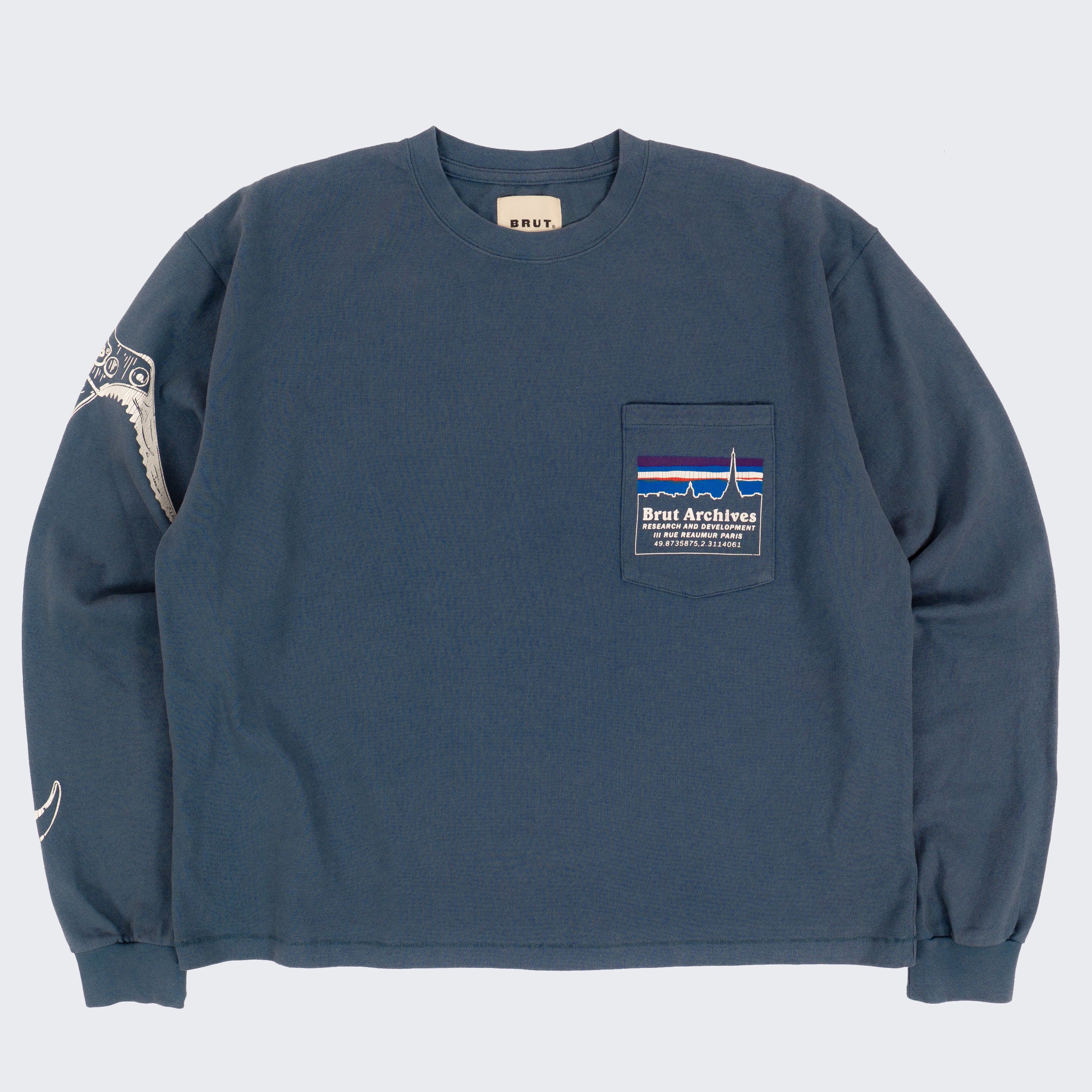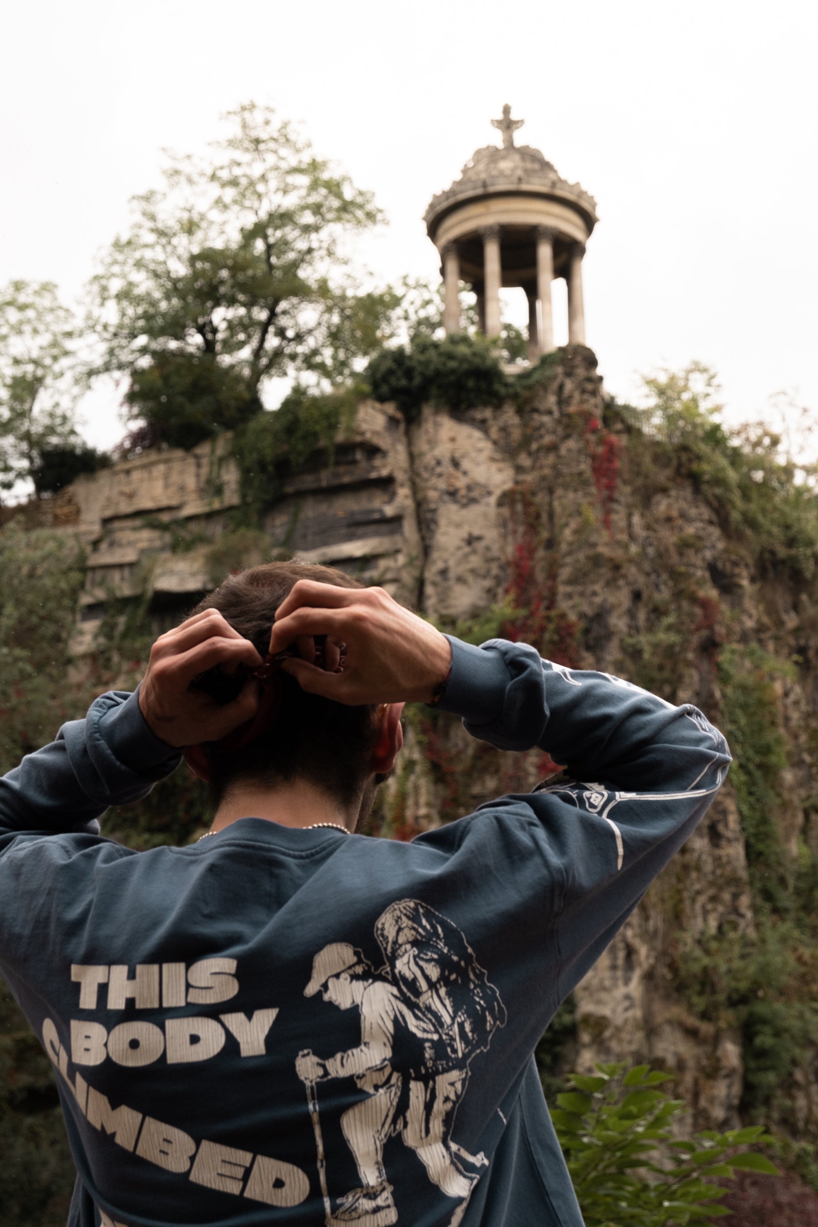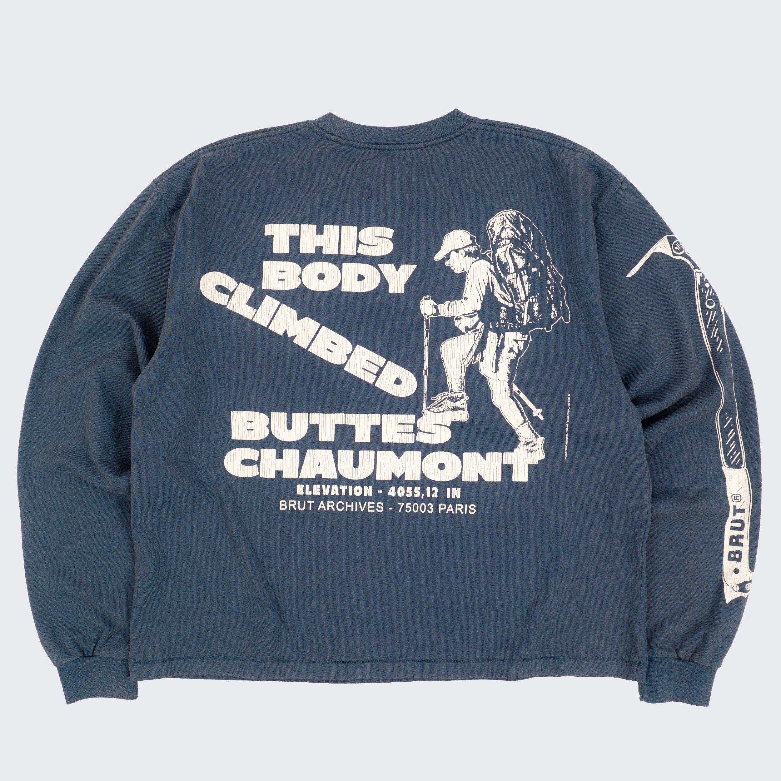 This navy long-sleeve tee features a vintage print, drawing inspiration from outdoor sports gear, especially "trophy" shirts from climbing, trail running, and hiking. All of it comes with a touch of irony and humor. Made from soft yet durable cotton, it offers both comfort and longevity, perfect for a casual yet stylish look.