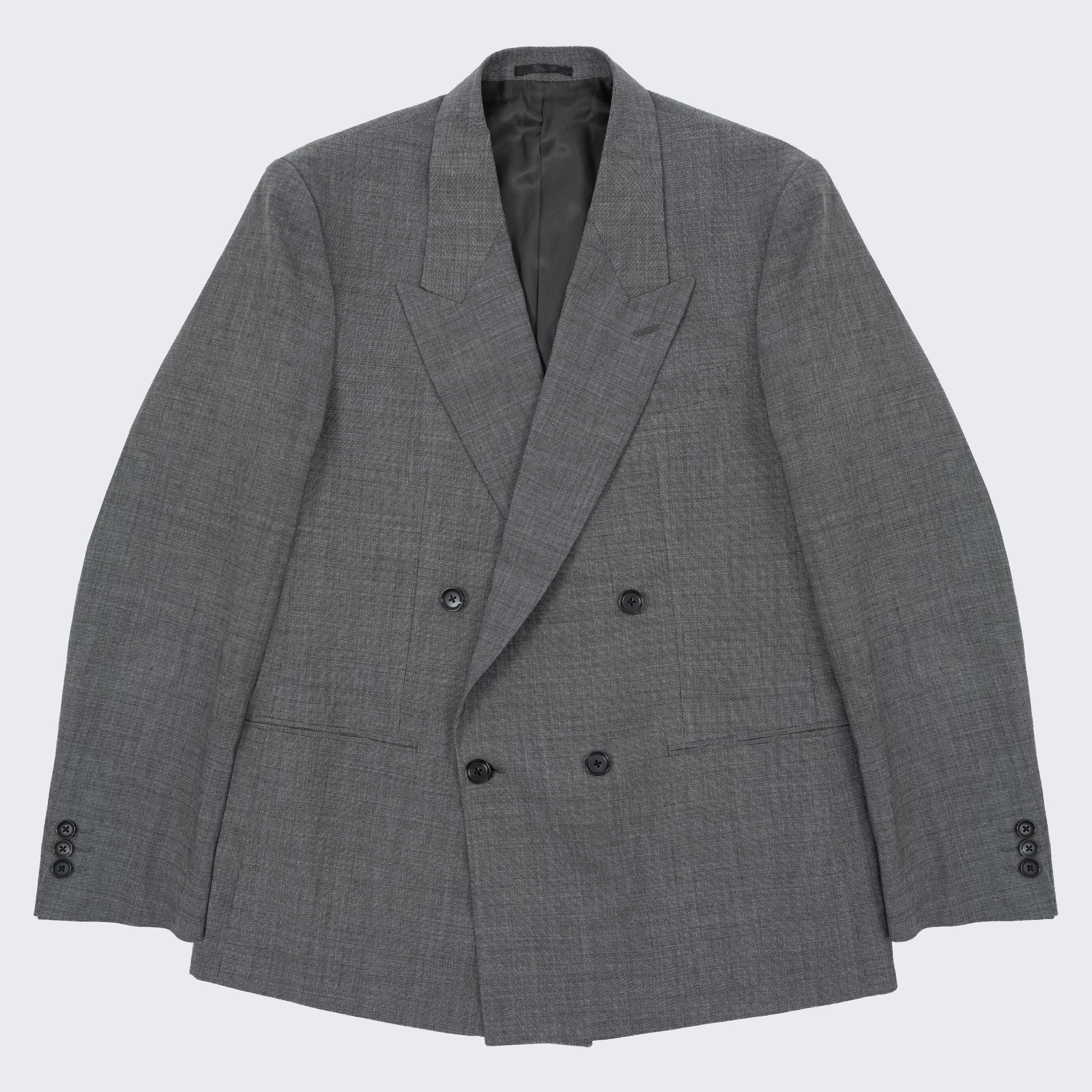 The jacket features a low four-button double-breasted closure and a lightly padded traditional shoulder. Functionnal elements such as internal pockets, a chest pocket and jetted side pockets.