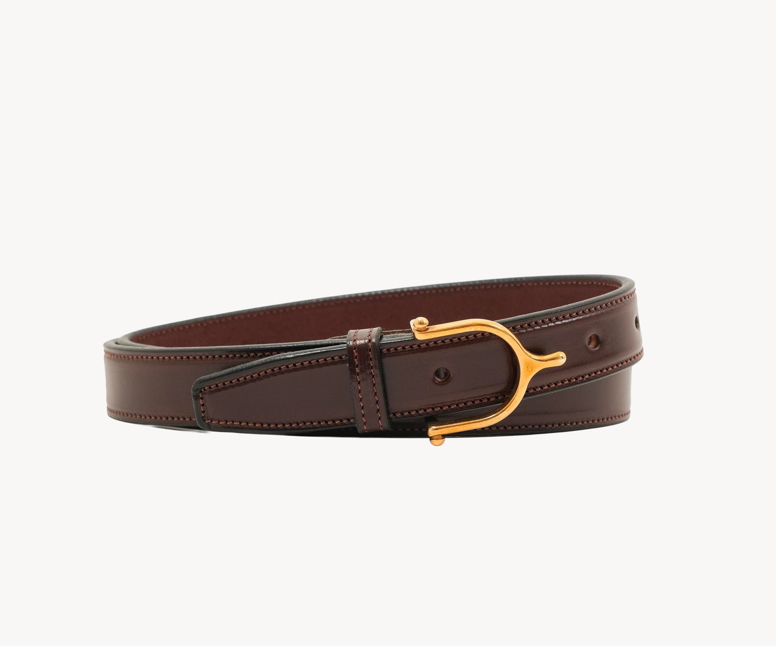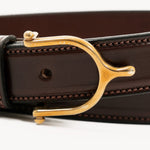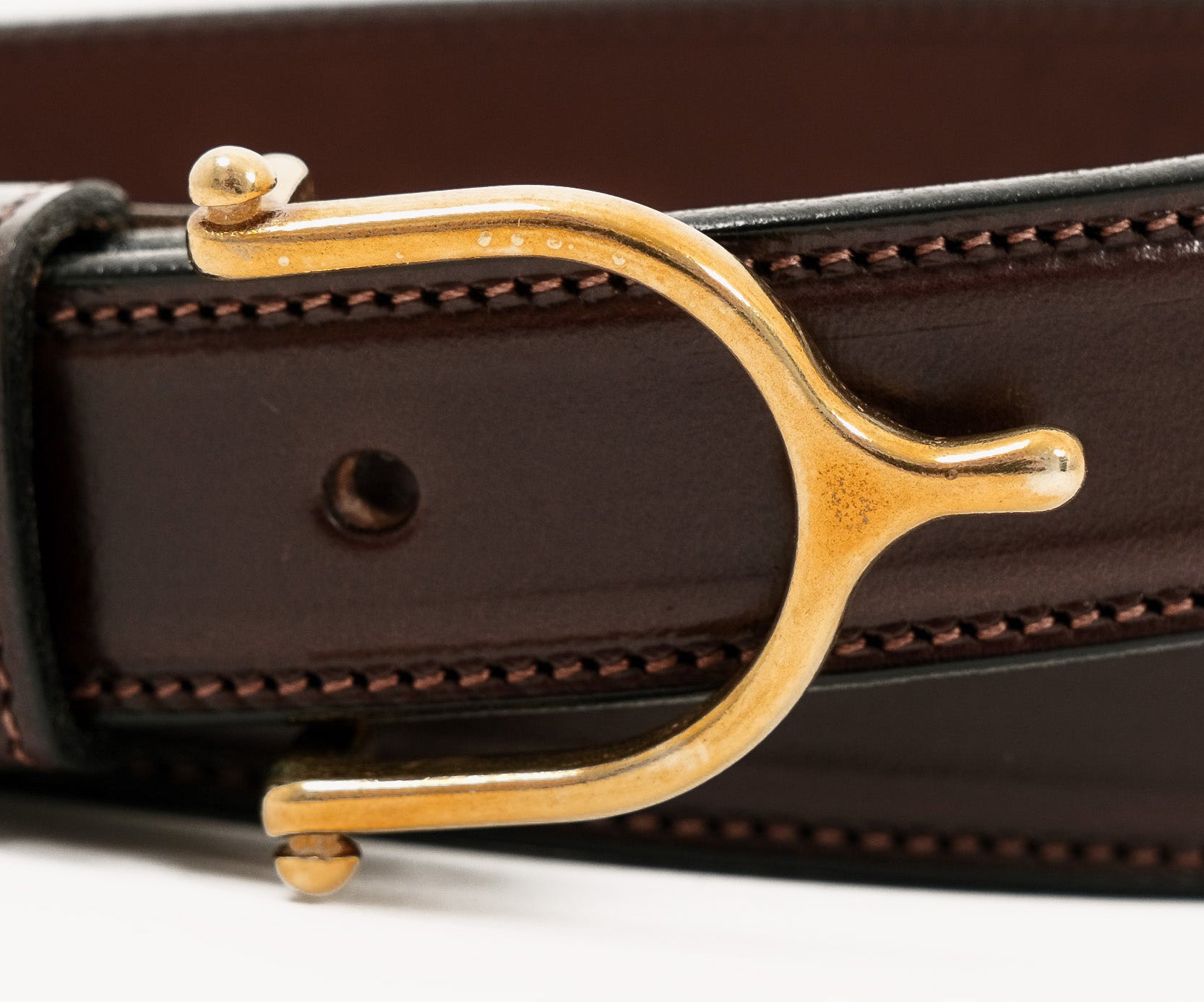 It features stitched edges, a sewn buckle closure and a brass english spur buckle.