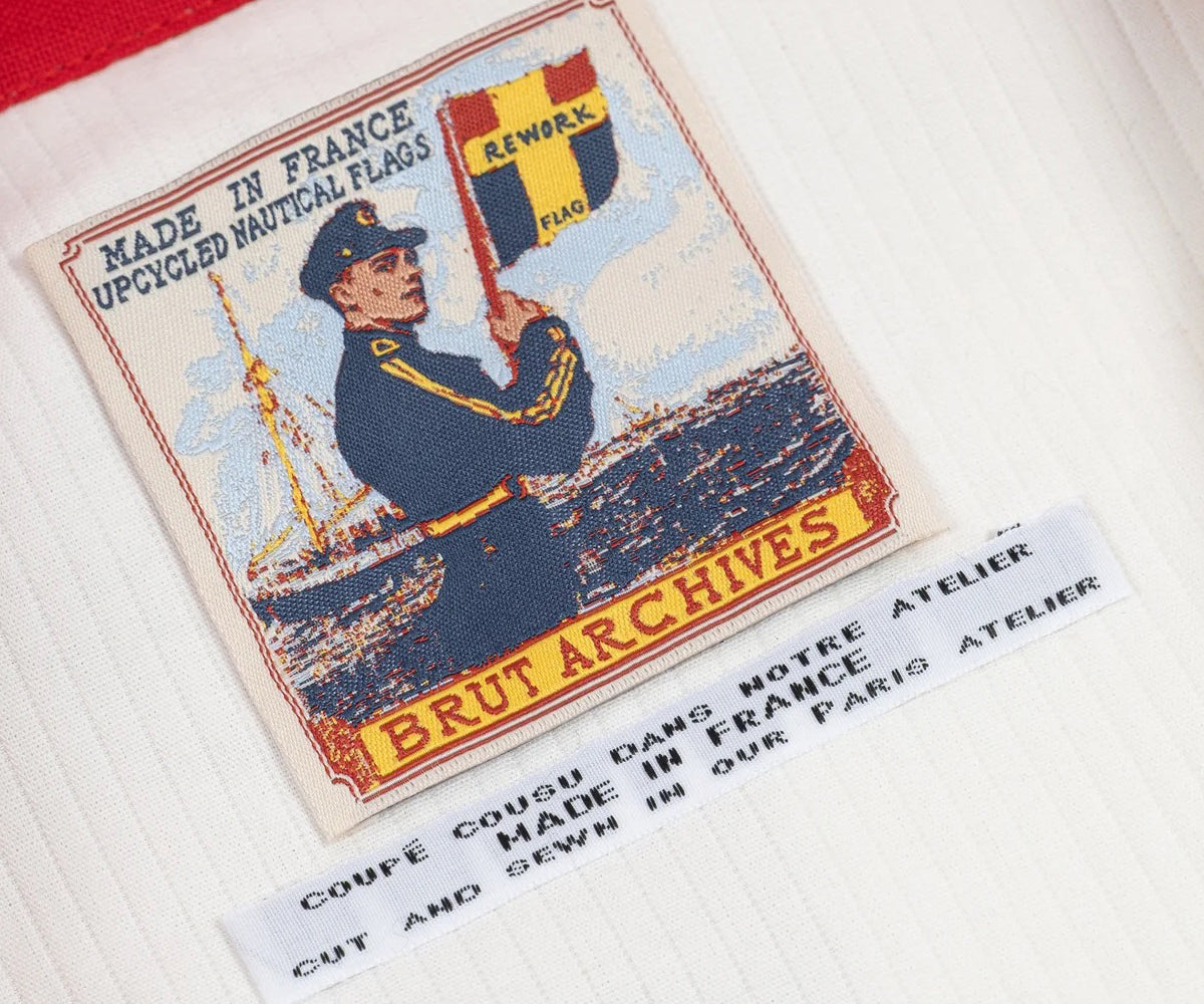 Crafted in our Parisian atelier from authentic vintage nautical flags, carefully reassembled into a bold patchwork design. Each panel carries its own story, showcasing the marks, colors, and textures of its past life at sea. One-of-a-kind.