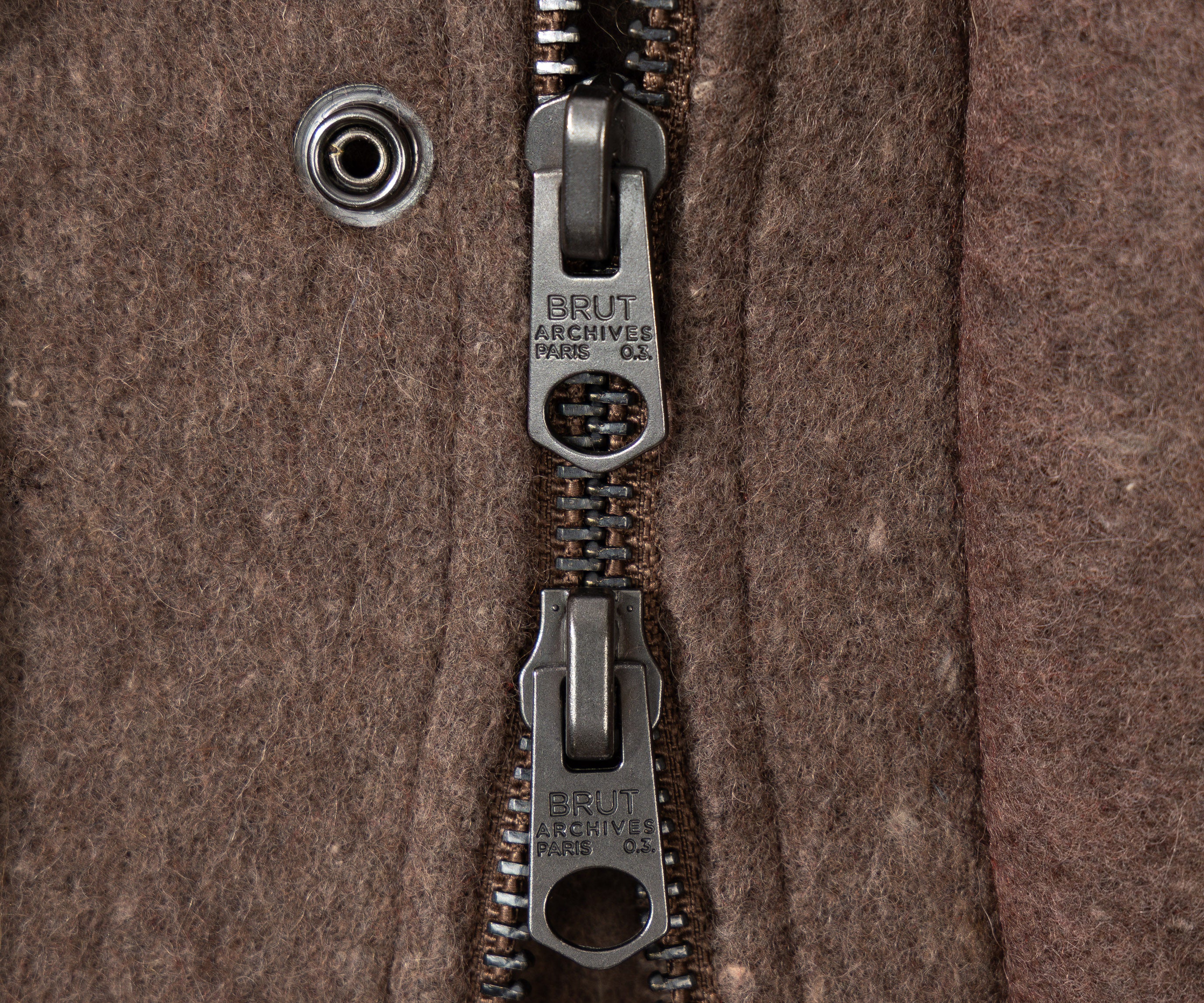 Two-way zip closure protected by a snap-button flap.