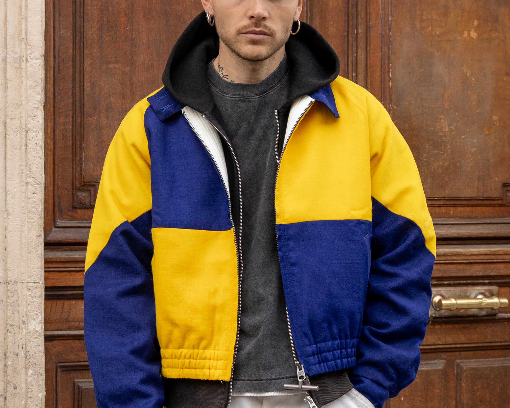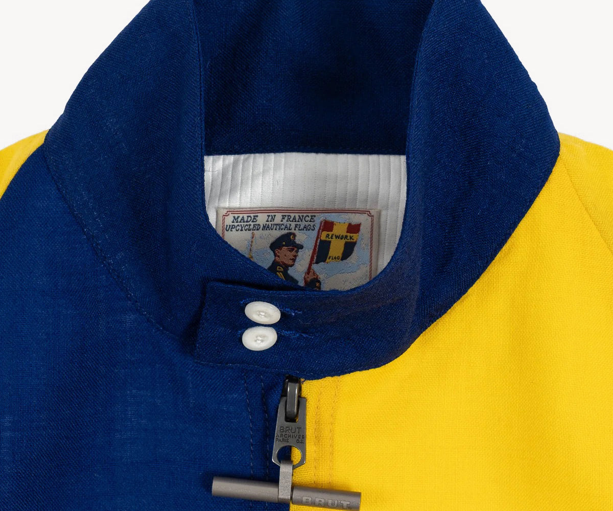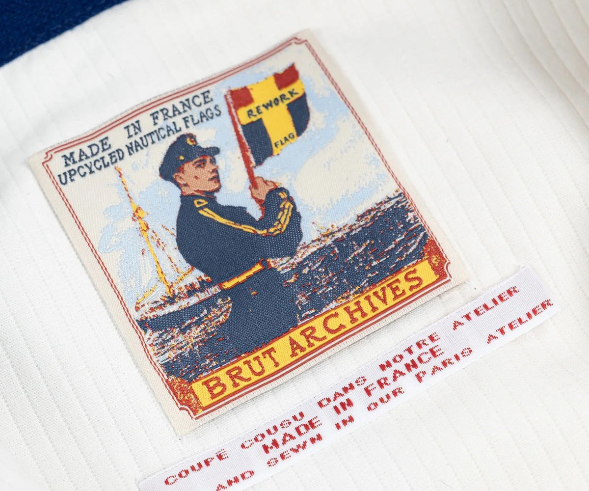 Crafted in our Parisian atelier from authentic vintage nautical flags, carefully reassembled into a bold patchwork design. Each panel carries its own story, showcasing the marks, colors, and textures of its past life at sea. One-of-a-kind.