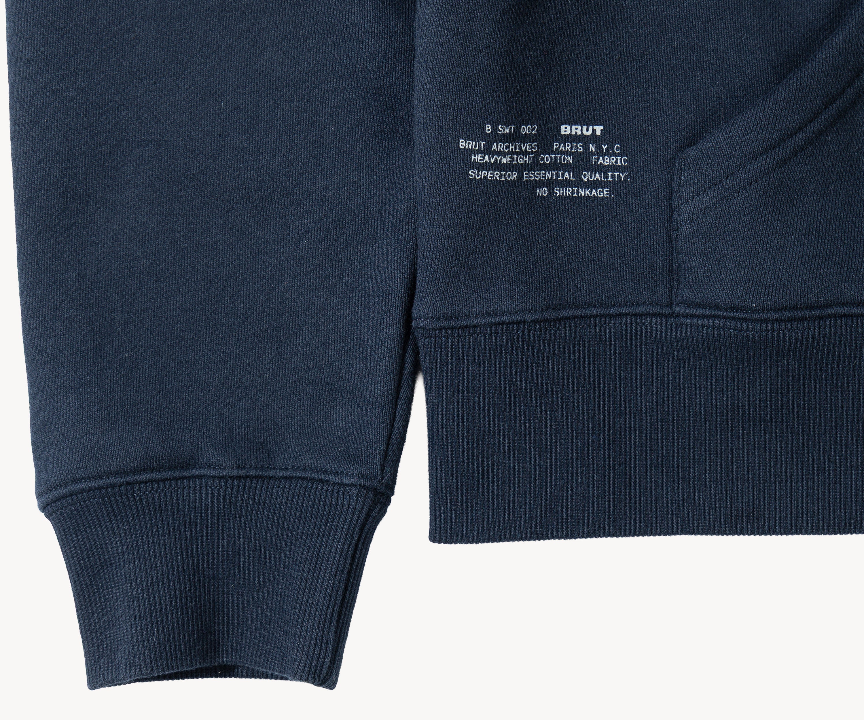 This sweatshirt represents BRUT's vision of the perfect hoodie, designed by our team in Paris after carefully studying the structure, design, weight, shape, and colors of our favorite vintage hoodies from our archive. After many samples, we arrived at what we deem to be the Best Sweat.