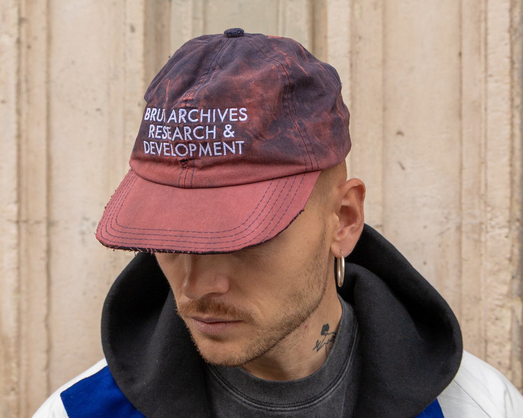 BRUT RESEARCH graphic embroidered on front.