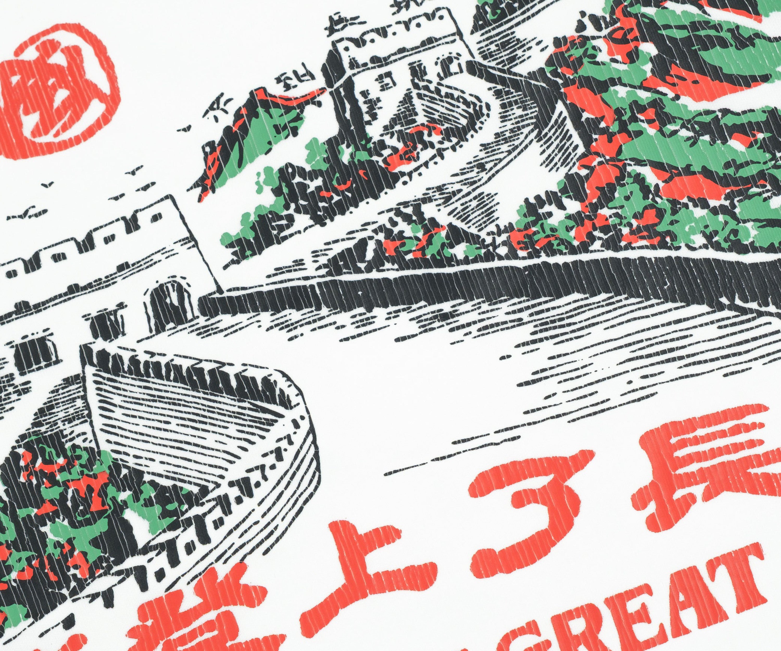 The GREAT WALL CLIMBER TEE draws inspiration from the iconic souvenir tee-shirts of the '90s. Crafted from high-quality cotton fabric.