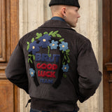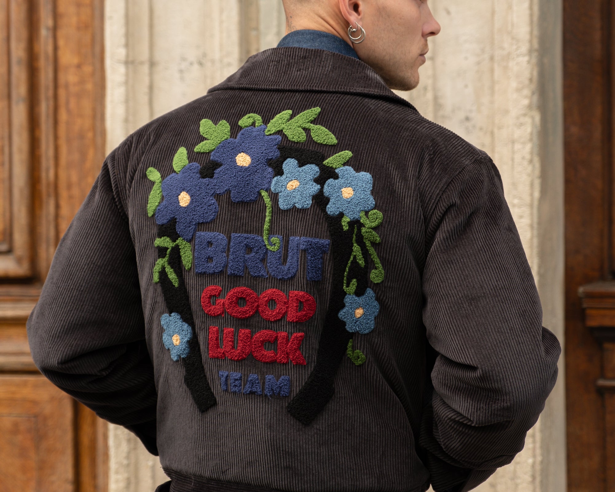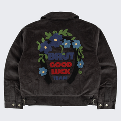 Chenille embroidery Brut Archives Lucky graphic on back.