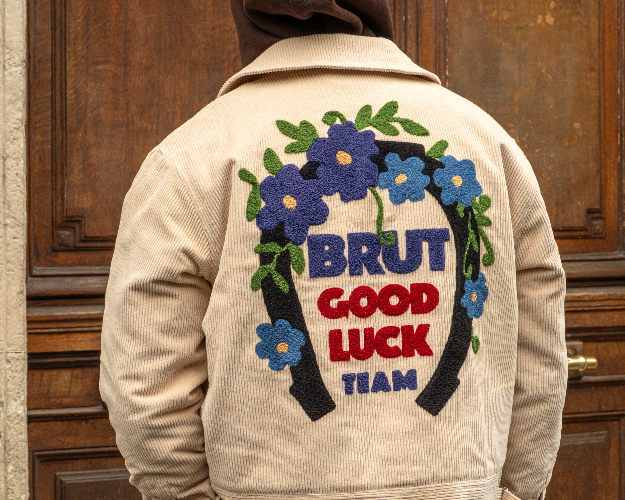 Chenille embroidery Brut Archives Lucky graphic on back.