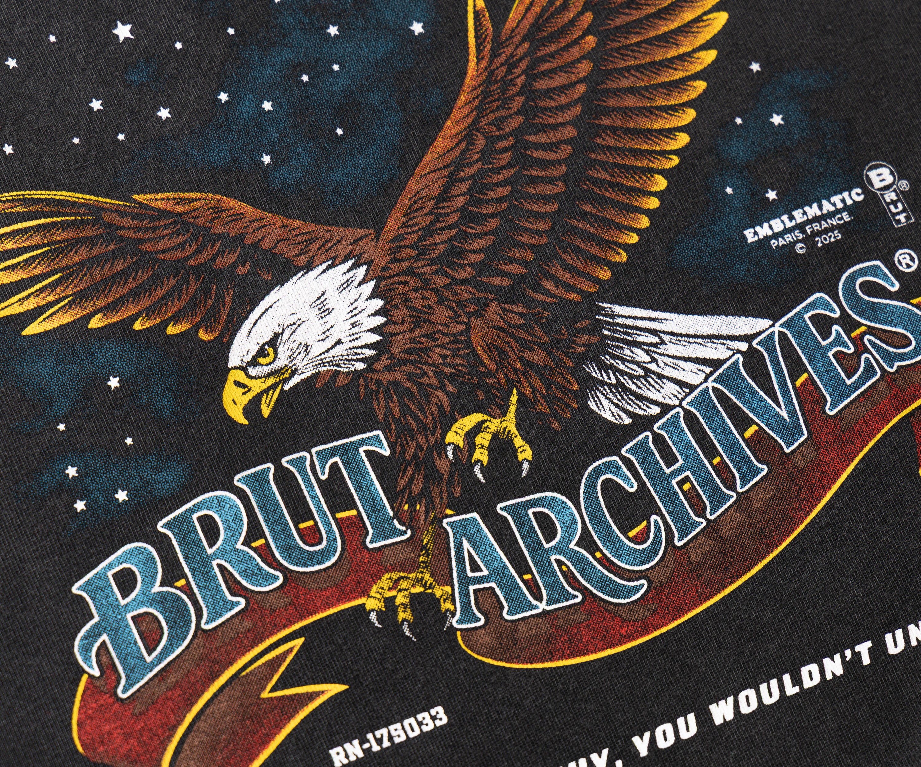 Brut Archives Night Eagle graphics screen printed on front and sleeves.
