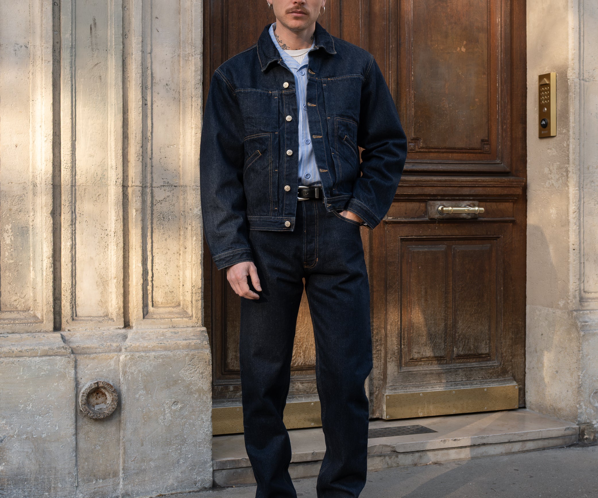 The PLEATED DENIM JACKET is a nod to American workwear design from our archives. Crafted from high-quality denim fabric, it is designed for all-day comfort. BRUT's commitment to quality ensures that this jacket will stand the test of time. Proudly made in Tunisia by a professional workwear factory.