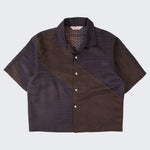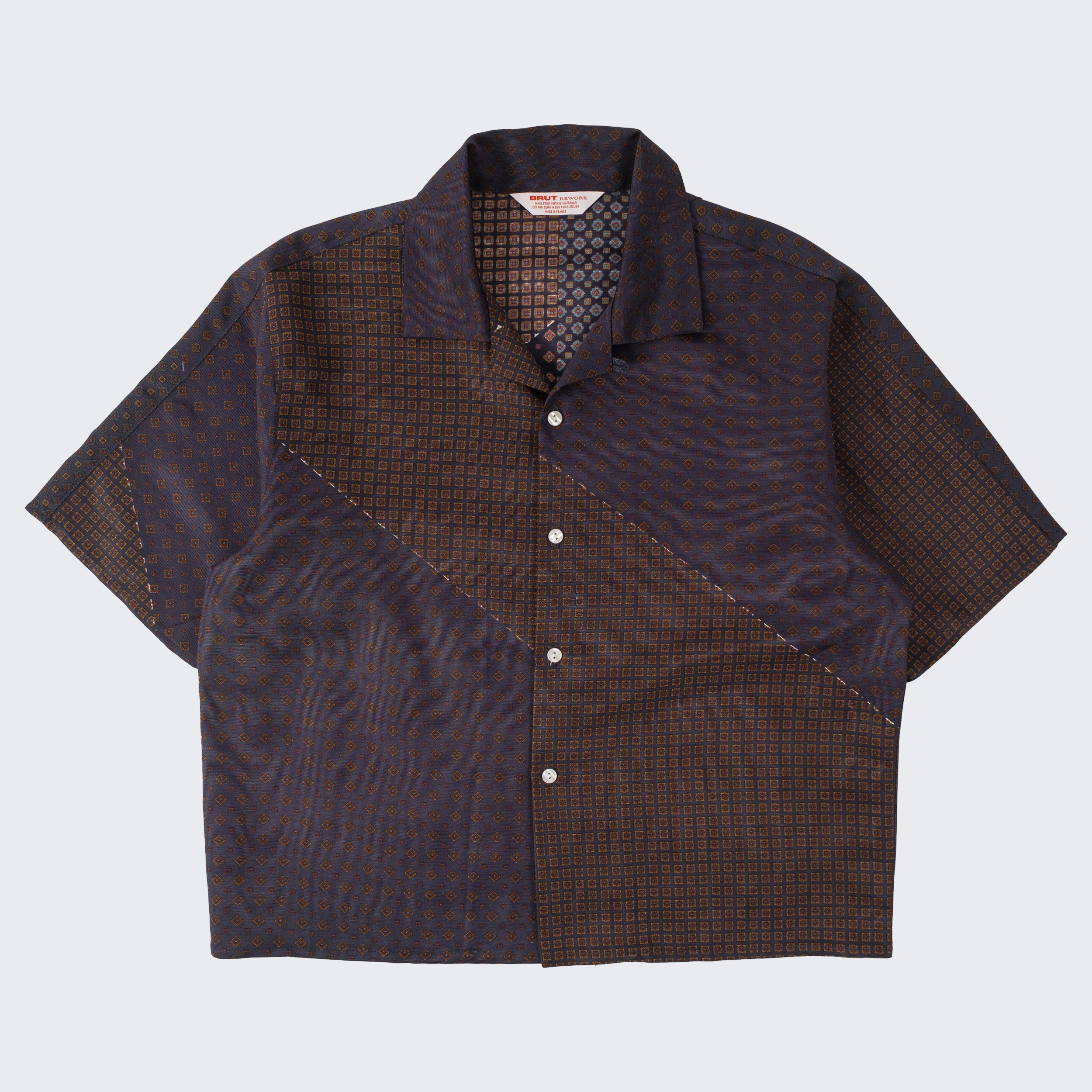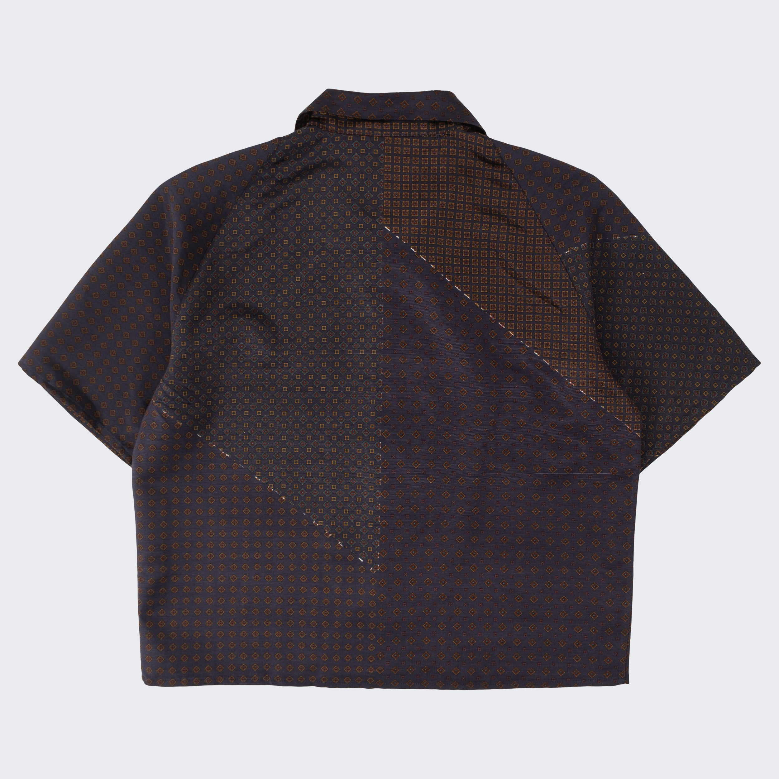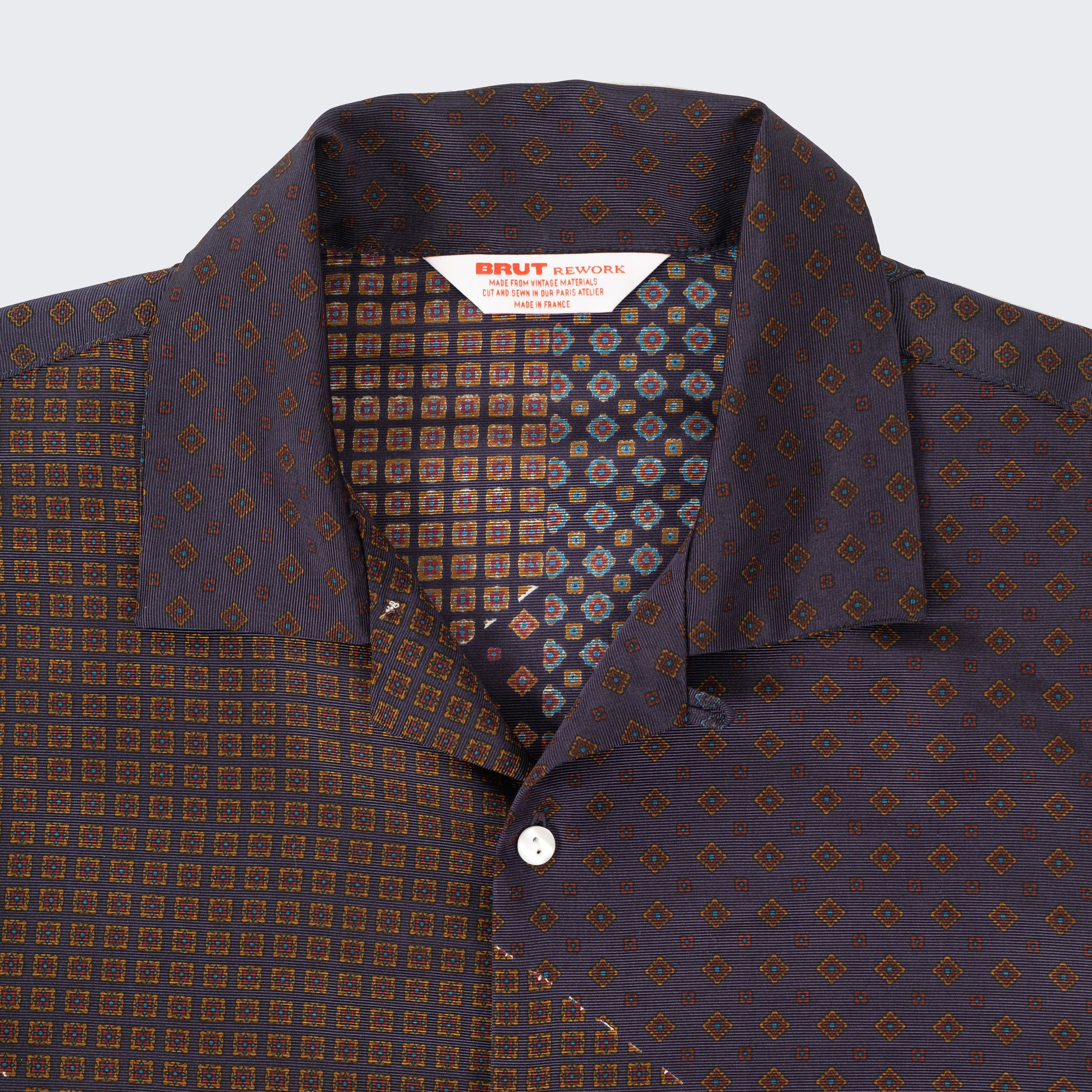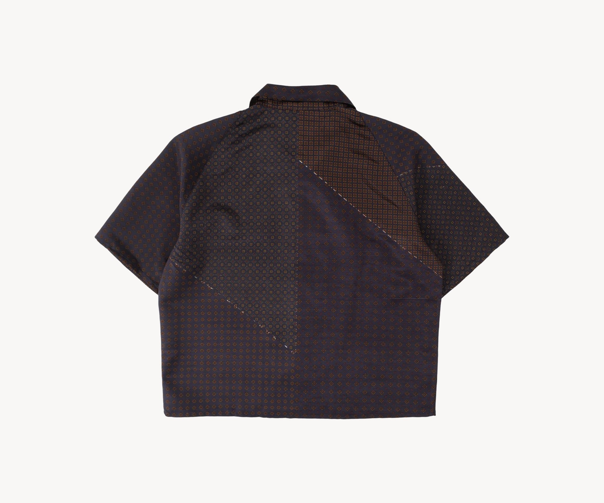 The TIE SHIRT is a mix of two rare shirts we have in our archive from the 1940's and 50's. The design consists of a short sleeves cropped shirt with a loop collar details. It is crafted from different deadstock fabrics which were intended for necktie manufacturing.