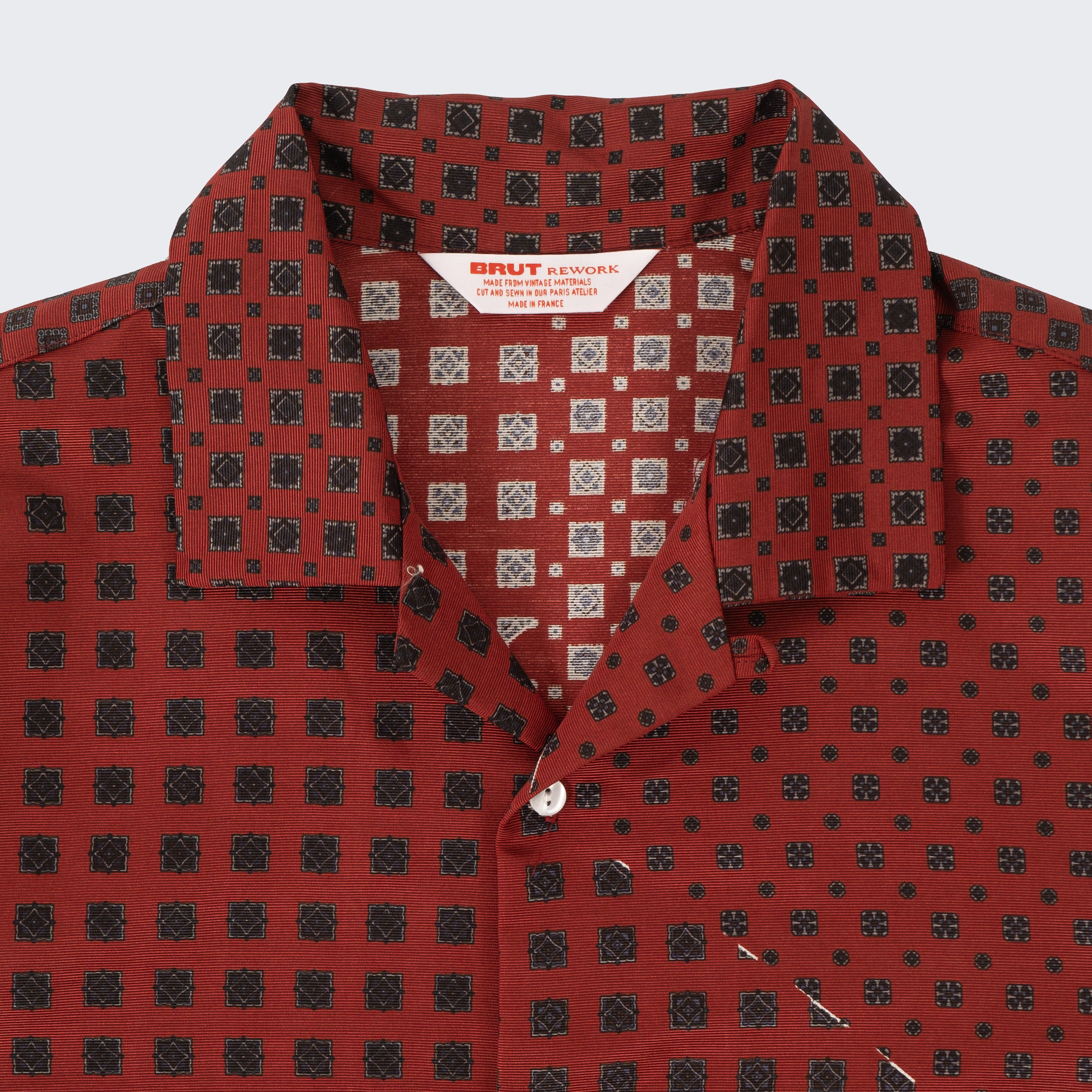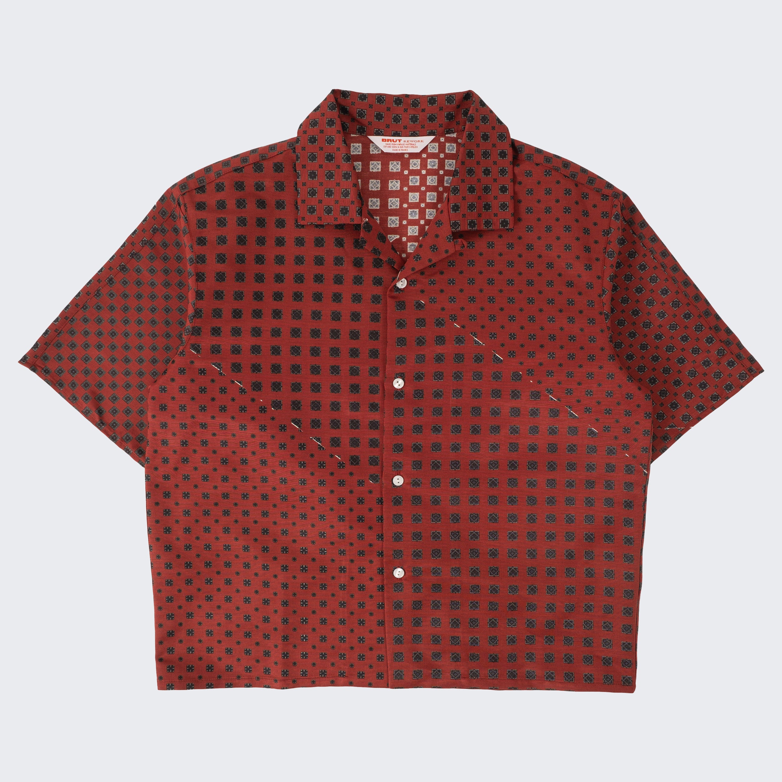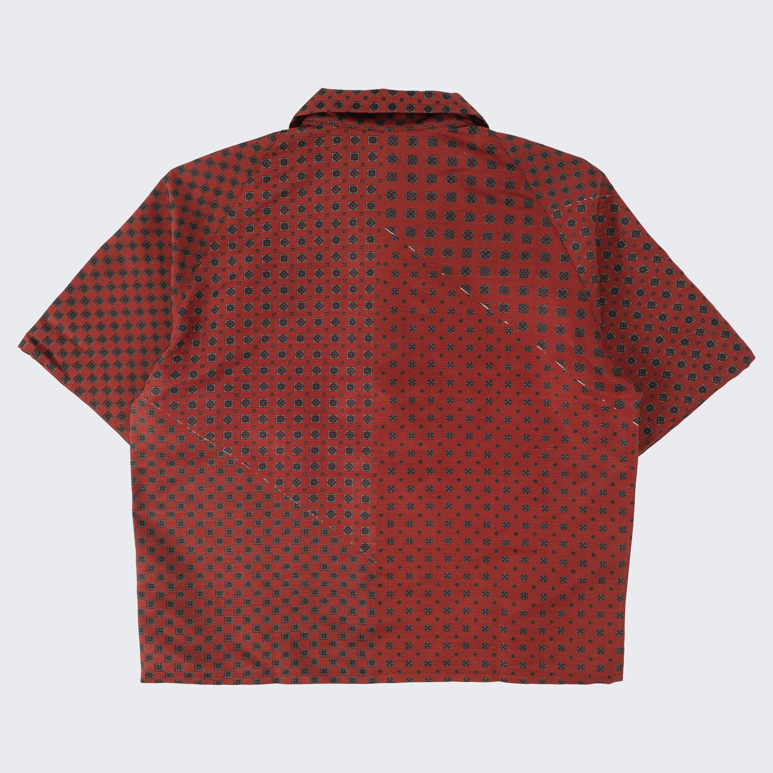 The TIE SHIRT is a mix of two rare shirts we have in our archive from the 1940's and 50's. The design consists of a short sleeves cropped shirt with a loop collar details. It is crafted from different deadstock fabrics which were intended for necktie manufacturing.