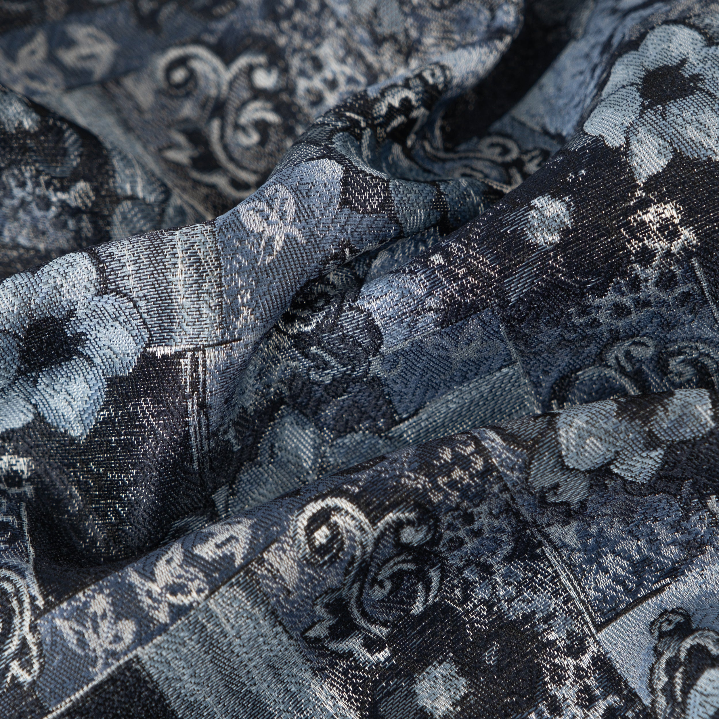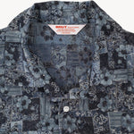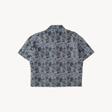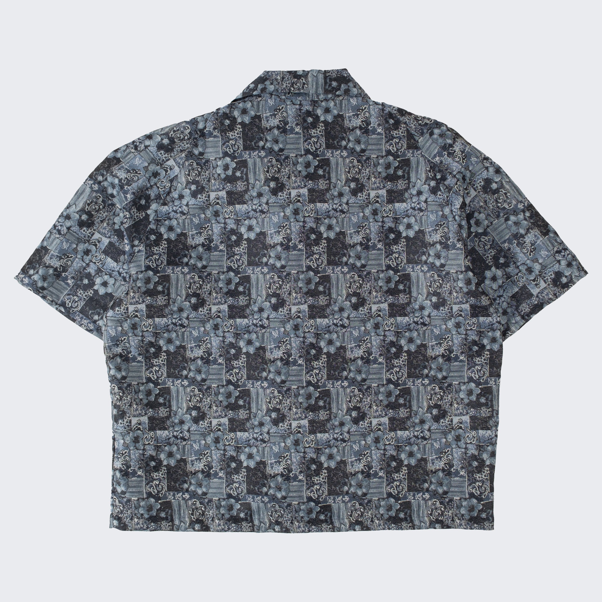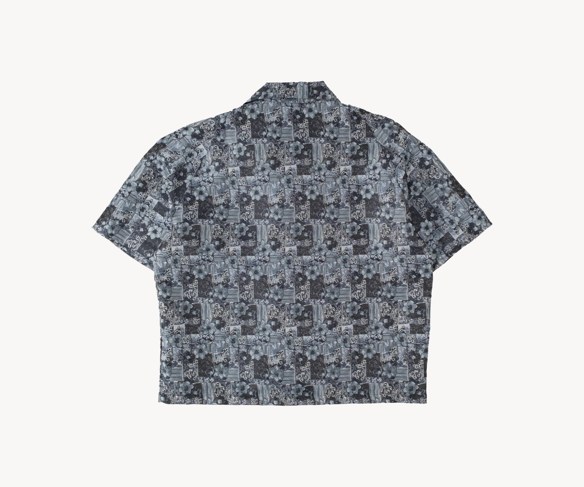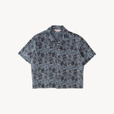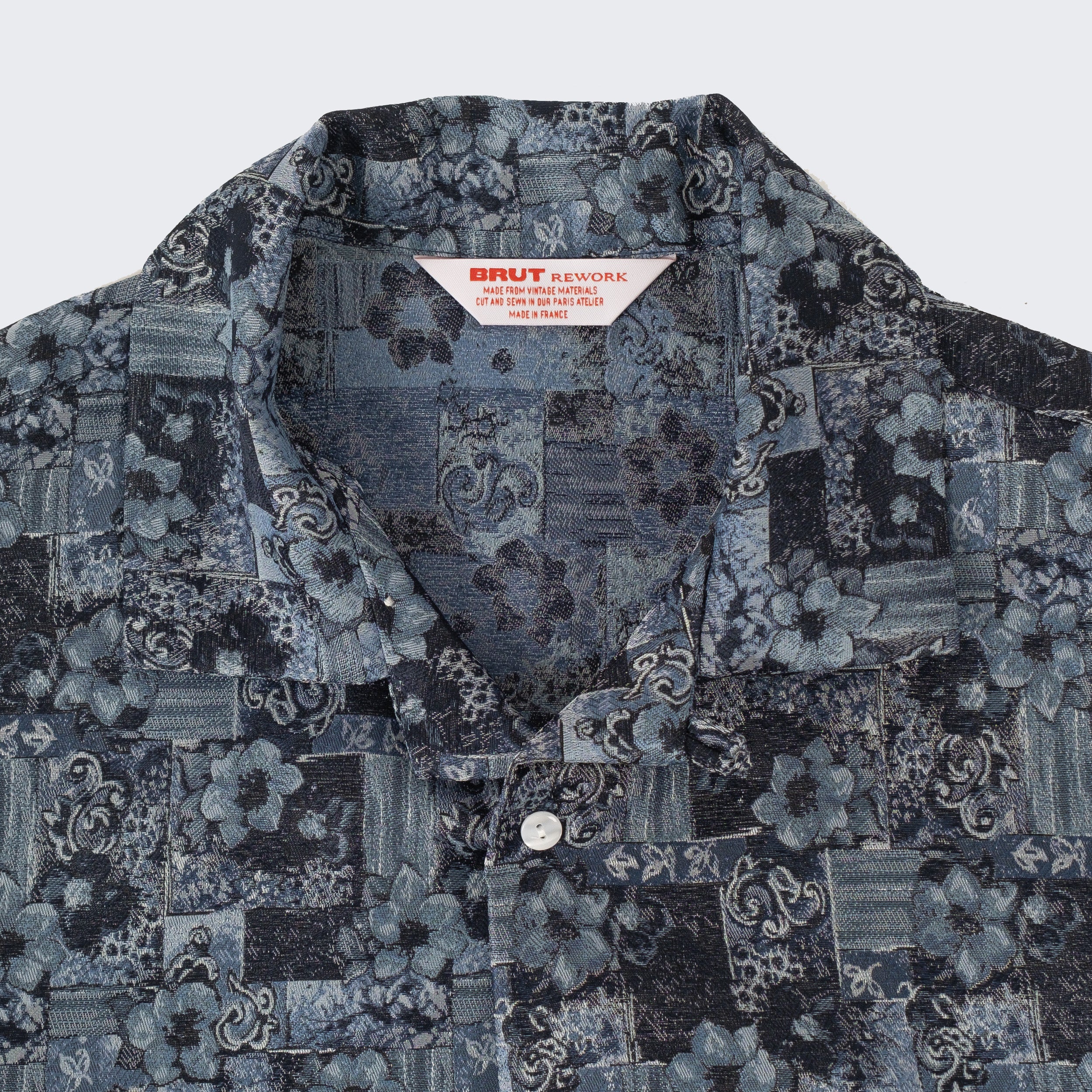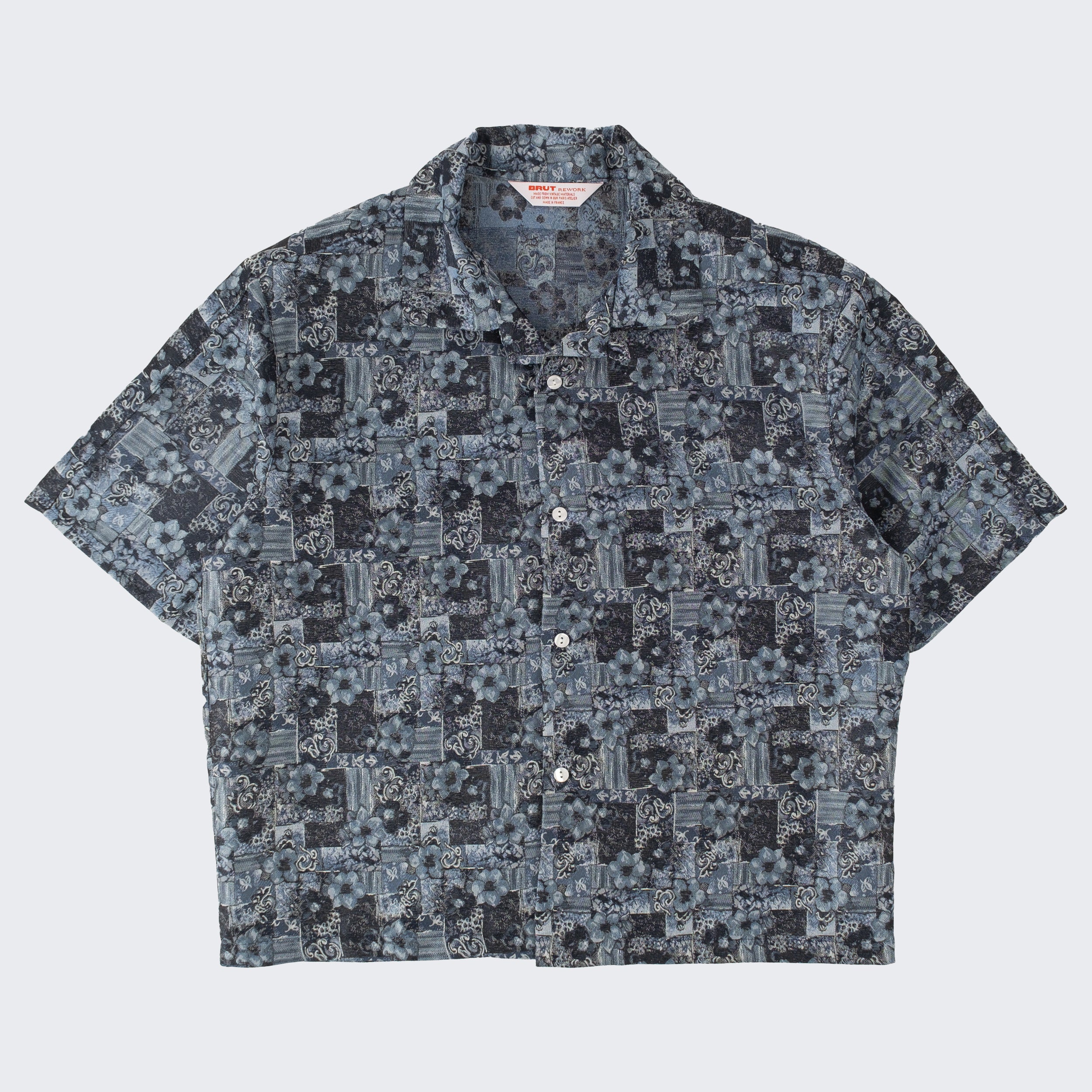 The TIE SHIRT is a mix of two rare shirts we have in our archive from the 1940's and 50's. The design consists of a short sleeves cropped shirt with a loop collar details. It is crafted from different deadstock fabrics which were intended for necktie manufacturing.